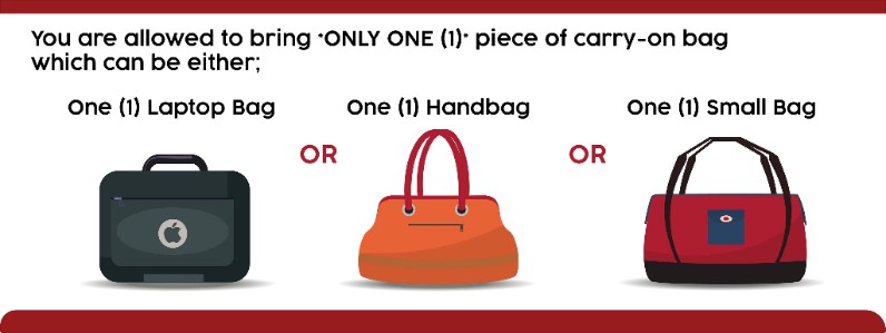 You may also carry one 1 piece of laptop bag handbag backpack or any other small bag which must not exceed 40cm x 30cm x 10cm.